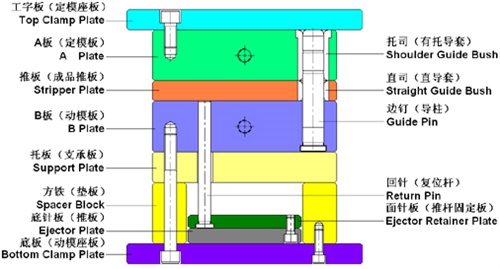 模架即模具的支撐,比方壓鑄機(jī)上將模具各局部按一定規(guī)律和位置加以組合和固定,并使模具能裝置到壓鑄機(jī)上工作的局部就叫模架,由推出機(jī)構(gòu)、導(dǎo)向機(jī)構(gòu)、預(yù)復(fù)位機(jī)構(gòu)模腳墊塊、座板組成。